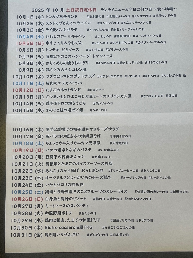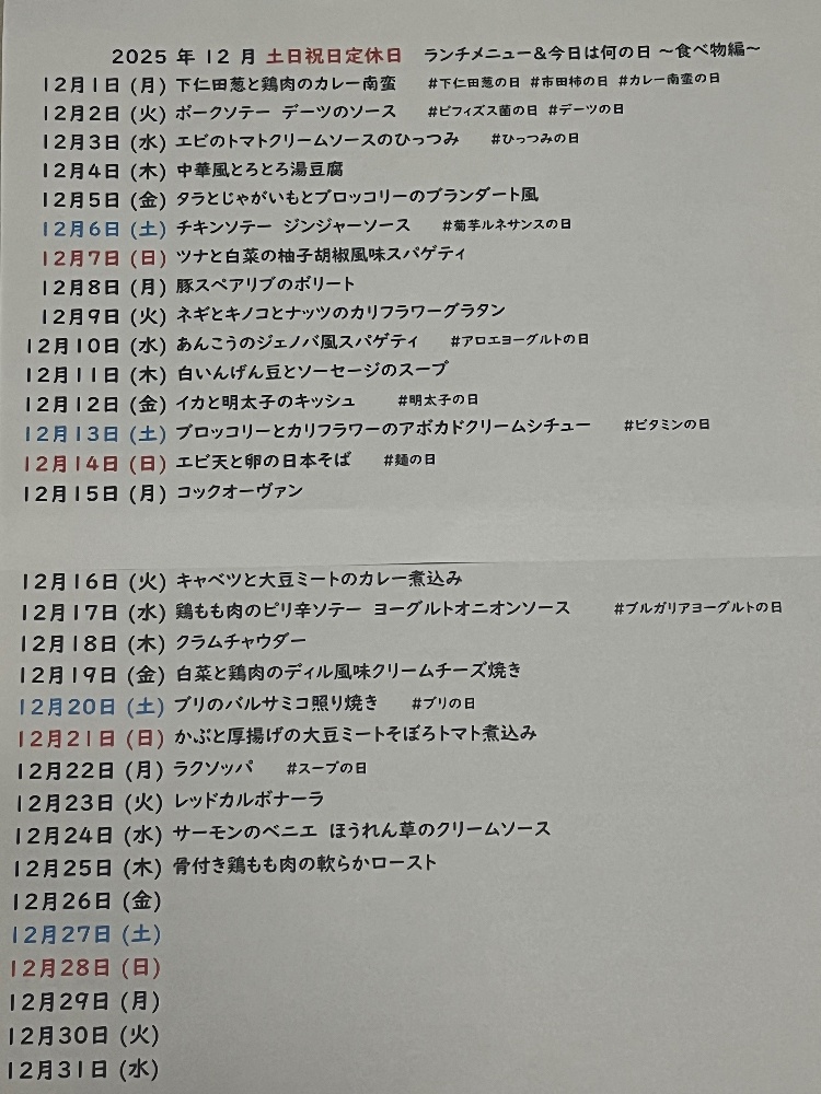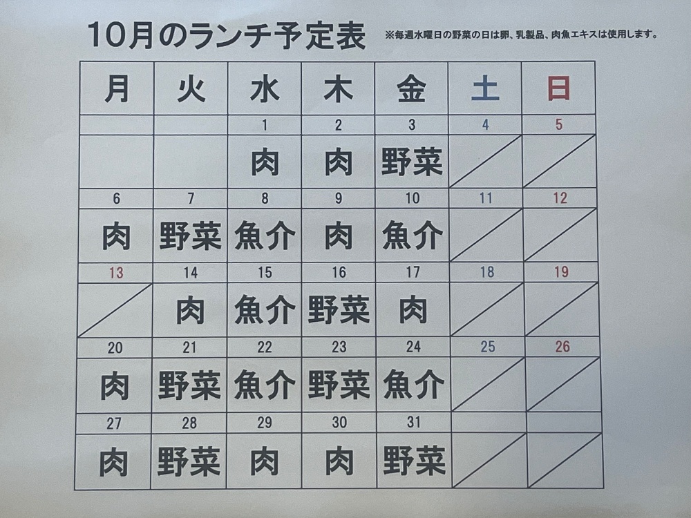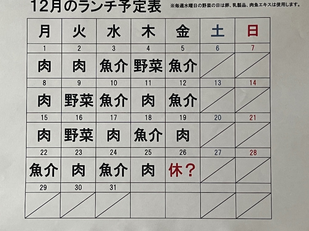 土日祝日にもメニューが書いてありますが、基本定休日となります。営業日はランチ予定表カレンダーでご確認下さい。