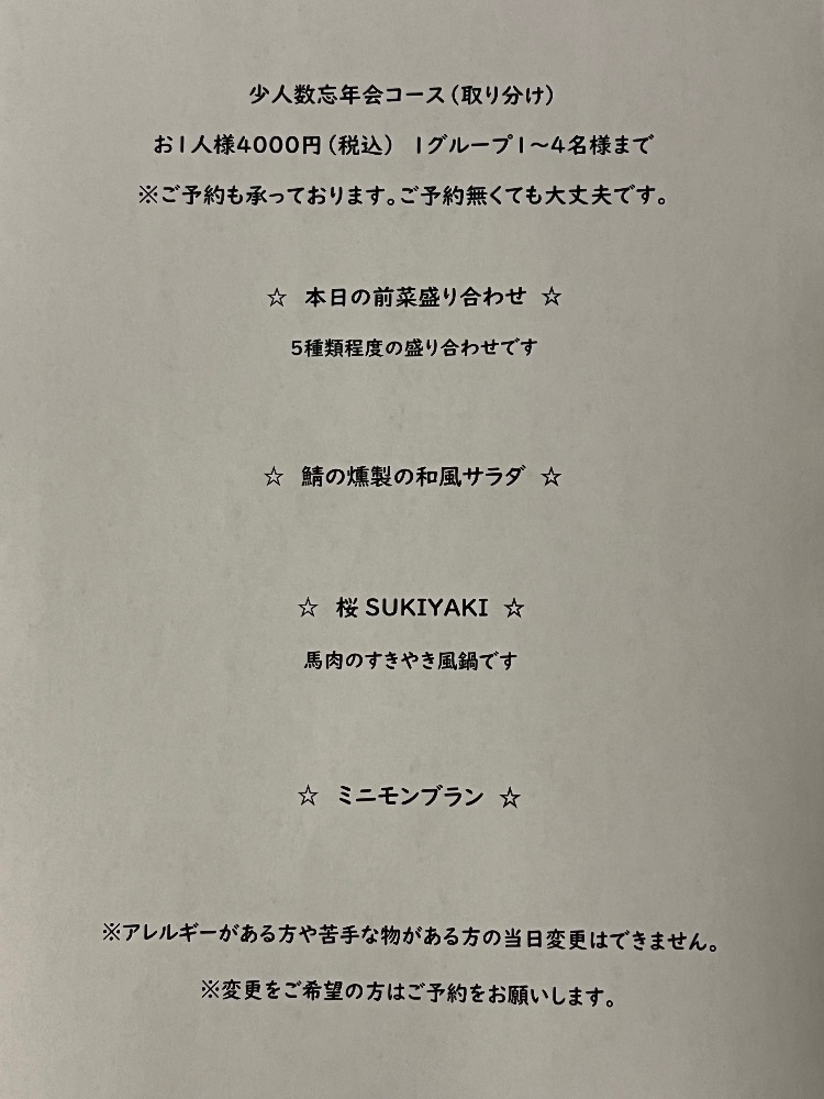 ※苦手な物やアレルギーのある方は当日の変更はできませんので、ご予約をお願いいたします。