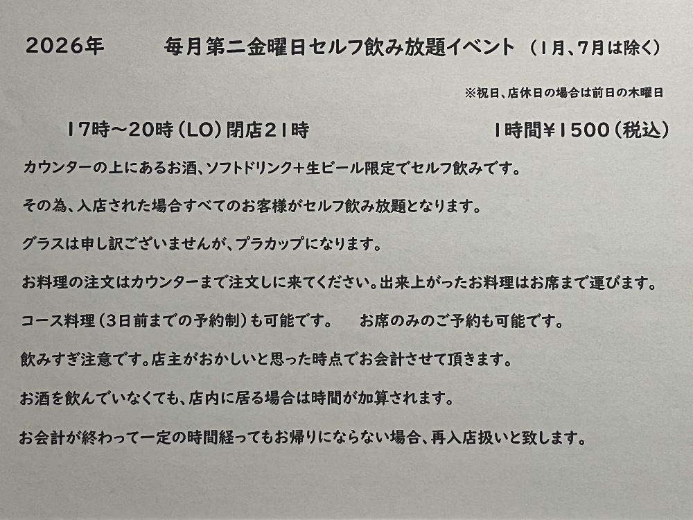 毎月第二金曜日はセルフ飲み放題イベントですご質問等はトップページのお問い合わせ、もしくは店頭でお願いします